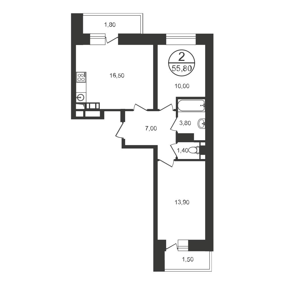 Угловое расположение «евро-двушек» гарантирует обилие света в кухне-гостиной, в линейных вариантах имеются один-два балкона: