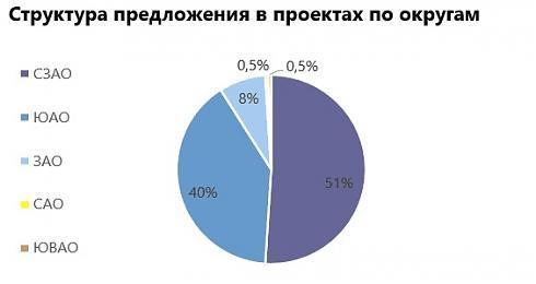 Если посмотреть на географию таких проектов, наибольший объем предложения сконцентрирован в двух округах: СЗАО (51%) и ЮАО (40%) - на них приходится 91% всей экспозиции. Около 8% экспонирующихся лотов локализованы в ЗАО. Доля САО и ЮВАО минимальна – по 0,5% от совокупного объема предложения.
