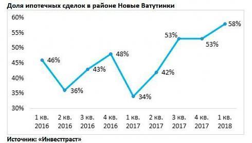 Начало 2018 года на рынке было отмечено рекордным спросом. В районе Новые Ватутинки по итогам I квартала было заключено в два с половиной раза больше сделок, чем годом ранее. Одновременно по количеству реализованных квадратных метров рост составил 2,3 раза. Таким образом, средняя площадь реализованной квартиры показала небольшую отрицательную динамику: со 51,2 кв. м в I квартале 2017 года до 46,4 кв. м в I квартале 2018 года.
