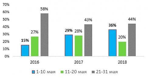 Согласно данным компании «Инвесттраст», впервые за последние три года в период майских праздников (1-10 мая) было заключено более трети (36%) всех сделок. Для сравнения – в мае 2017 года на начало месяца пришлось только 29% сделок, а на аналогичный период 2016 года – всего 15%. При этом общее количество договоров в мае 2018 года в два раза превысило показатели последнего весеннего месяца 2017 года и на 60% – мая 2016 года.