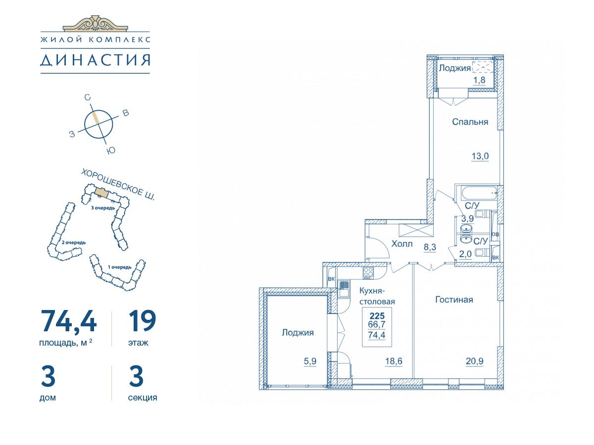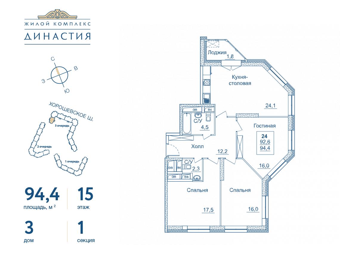 Третий дом — завершающий этап строительства жилого комплекса «Династия». Внешний фасад выходит на Хорошевское шоссе, его декоративный ажурный орнамент является визитной карточкой проекта. Оригинальная геометрия дома обеспечивает выбор планировочных решений из более чем 80 базовых вариантов. Из девяти секций дома — две угловые, две торцевые и поворотная с широким углом обзора. Благодаря этому в ряде однокомнатных квартир предусмотрено четыре окна и лоджия, треть квартир имеют две и более лоджий, двух- и трехкомнатные — функциональные ниши для организации систем хранения. Площади однокомнатных квартир от 40 до 55 кв. м, двухкомнатных — от 59 до 80 кв. м, трехкомнатных — от 86 до 102 кв. м. В числе особых предложений — 16 квартир с открытыми террасами, квартиры с окном-розой диаметром 5,4 м.