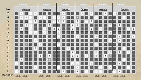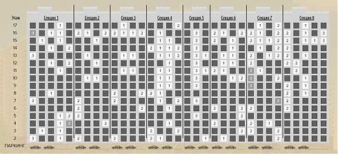 Корпус №1 представляет собой 8-секционное 17-этажное здание. Квартиры, коих в наличии осталось порядка 150, расположены тут начиная со второго этажа, первый отведен под паркинг. Свободными на данный момент остаются однокомнатные квартиры, размером от 41,5 кв. метров, двухкомнатные, метражом от 64 квадратов, и примерно полтора десятка трехкомнатных вариантов, площадью от 84,4 кв. метров.