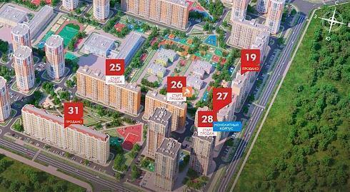 Панельные корпуса №№ 19 и 31 распроданы полностью. На данный момент в продаже есть квартиры в 17-этажных 3-секционных панельных домах №№ 26 и 27 и в 5-секционном корпусе №25. В корпусе 26 жилье предлагается с отделкой.