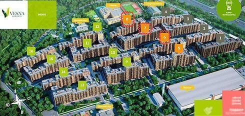 Это корпуса под номерами 6, 7 и 8, в общей сложности рассчитанные почти на 47,7 тыс. жилых квадратных метров и на 971 квартиру. Дома возведены по монолитной технологии, высота их секций варьируется между 6, 9 и 12 этажами. На генплане новостройки, видим, что продажи в этих домах идут до сих пор и на сегодняшний день в реализации находится: