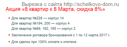 С 1 по 12 марта 2017 года в жилых комплексах от компании «КОРТРОС» у Вас есть возможность приобрести жилье по специальной цене – со скидкой в 8 процентов, правда, действие этой акционной программы, приуроченной к Дню 8 марта, распространяется на определенный пул квартир. Так, например, в ЖК «Прима Парк», расположенном вдоль улицы Барышевская Роща города Щербинка НАО, в акции участвуют восемь квартир в корпусах под номерами 15, 22 и 23. А в, возведенном на улице Фрунзе города Щелково, микрорайоне «Богородский» с 8%-ной скидкой можно купить одну из восьми квартир, расположенных в корпусах 2, 4 и 14.