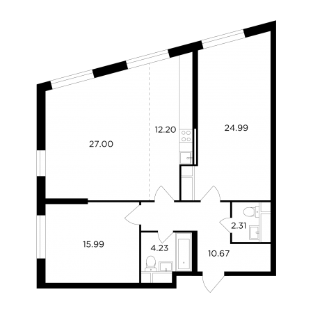Новый корпус состоит из трех 30-этажных секций, в которых запроектировано 513 квартир, реализуемых как с ремонтом от застройщика, так и без него. В жилой фонд дома включены самые различные планировочные решения, как в классическом, так и в европейском формате – от небольших и компактных студийных вариантов, до интересных четырехкомнатных квартир. Площадь их варьируется от 23,6 кв. метра до 130. Высота потолков в некоторых предложениях достигает 3,2 метра. Также можно приобрести лот с террасой или панорамным остеклением – они располагаются на последних этажах корпуса.