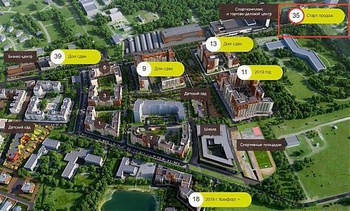 Речь идет о квартирах в корпусе под номером 35, который расположен на некотором удалении от других домов новостройки, но рядом со спортивным комплексом и торгово-деловым центром.
