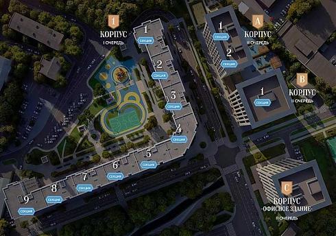 В состав второго этапа строительства проекта вошли два жилых корпуса, под литерами А и В, а также здание офисного центра – корпус С. Общая площадь застройки составляет более 59 тыс. кв. метров.