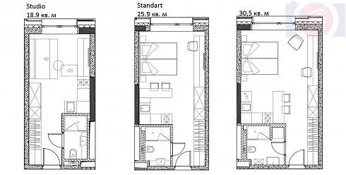 Что касается выбора, то он, в соответствии с законами жанра, ограничен донельзя. В категории STUDIO представлены 19-метровые пеналы, в категории STANDART находятся более оптимальные по своим характеристикам студии: