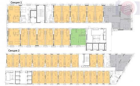 Дом формально является двухсекционным, но монументальной перегородки между секциями нет, поэтому на одном Г-образном этаже здесь расположено 46 апартаментов: