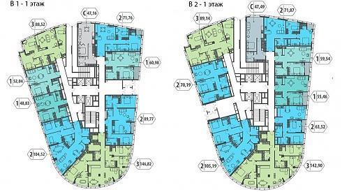 По мнению главного архитектора Москвы Сергея Кузнецова, высказанному им на заседании Архсовета, «основная акцентная часть въезда в город должна быть выражена». Сказано – сделано: в выразительности одноподъездным корпусам В1 и В2 никак не откажешь. Каплевидная форма зданий не могла не сказаться на внутреннем содержимом, а потому формы многих из представленных в них квартир оказались далеки от классических. Тем не менее, духу жилища здесь будет, где развернуться – с метражами квартир все обстоит просто замечательно. За исключением первых этажей, оба корпуса являются копией друг друга.