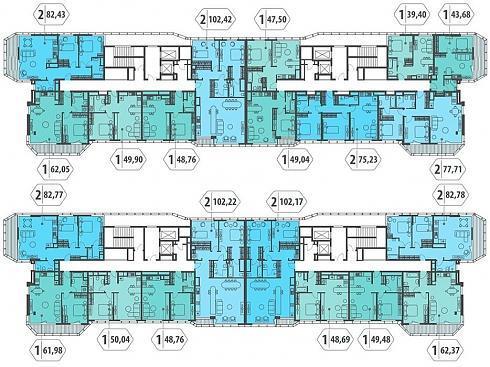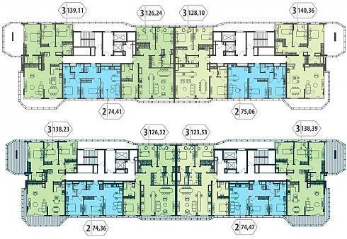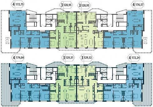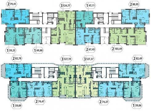 Дальше – больше (вернее – меньше). 1, 6, 7 этажи корпуса С1, и 1, 9, 10 этажи корпуса С2 занимают четыре квартиры: