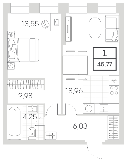 1-комнатная апартаменты 45.77 м