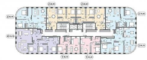 Фасады состоят сплошь из окон, поэтому разделение на количество комнат тут выглядит во многом условно. Однокомнатная квартира может быть меньше чем студия, а ее 45-метровая версия легко потянет на «евро-двушку»: