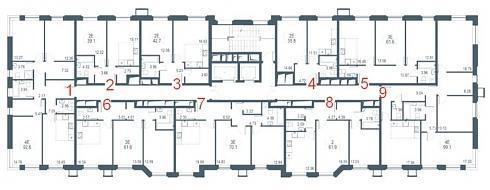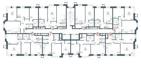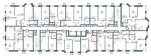 а вот в корпусе №2, где устанавливается три лифта (1 грузопассажирский и 2 пассажирских) на лестничной клетке окажется уже 13 квартир:
