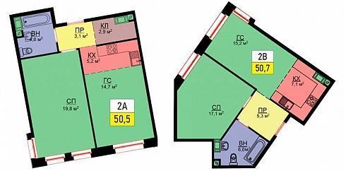Даже планировочные решения «двухкомнатных» вариантов с площадью, превышающей 50 кв. м, при всех их непохожести подразумевают получение на выходе апартаментов студийного типа: