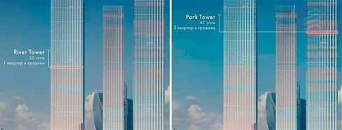 Корпус 1 (River Tower): 61 этажа, 209 квартир, 517 машиномест в 5ти уровневом подземном паркинге.