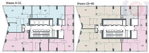 В корпусе River Tower квартиры расположены по 40 этаж, а все, что находится выше, занимают офисы, но эти кластеры никак не пересекаются: 5 лифтов, обслуживающих жилую зону, находятся в отдельном лифтовом холле. На этажах с 4 по 21, а также на 40 этаже здесь расположено по пять квартир,
