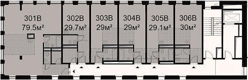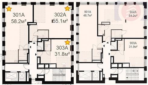 Со второго по девятые этажи в высокой секции комплекса на лестничной клетке расположено по 3 апартамента. Их конфигурация на 2-7 этаже не совпадает с таковой на 8-9 этажах.