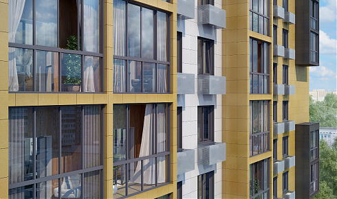 В выступающих на фасаде прямоугольниках прячутся застекленные в пол балконы, положенные почти всем квартирам ЖК. Исключение – двухкомнатные квартиры в первой секции, граничащие со второй, в них обустроена большая шестиметровая лоджия.