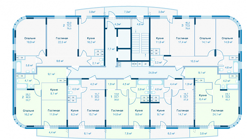 Поскольку дом является одноподъездным, а планировки квартир на каждом этаже абсолютно идентичны, покупателю остается лишь определиться с количеством комнат и выбрать искомый этаж. Первый этаж здесь неожиданно оказался жилым, те квартиры, окна которых выходят на подъезд, лишены лоджий. В остальных квартирах Комплекса лоджии есть, причем строго по одной, в независимости от количества комнат. На любой лестничной клетке расположены семь квартир: одна трехкомнатная, две двухкомнатные и четыре однокомнатные.