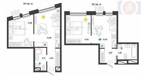 Евро-двушки квадратной формы есть в обоих корпусах «Донского Квартала», при этом площадь спальни в обоих вариантах совпадает, а вот кухня-гостиная и санузлы спланировано по-разному: