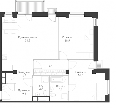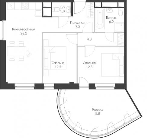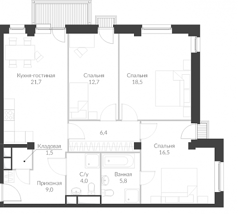 Помимо обычных лоджий и балконов, панорамно застекленных, а также и французских балконов, в некоторых квартирах есть террасы. Вот так это выглядит на планировке: