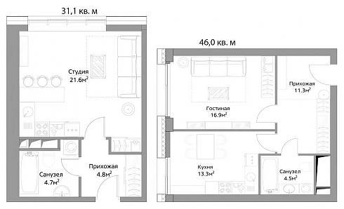 Студии здесь формально отсутствуют, хотя квартиры с площадью в районе 31-32 кв. м именно студиями и являются. Площадь однокомнатных квартир с классическим делением метров между кухней и жилой комнатой превышает 45 кв. м: