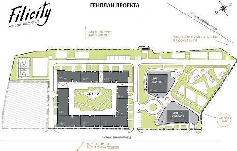 О планах Девелоперской компании MR GROUP, задумавшей построить ЖК «Фили сити» на месте цехов бывшей фабрики мороженого Айс-Фили, стало известно еще в октябре 2016 года. Собственно говоря, мороженое здесь не выпускалось с конца девяностых, а в феврале 2016 было ликвидировано и ООО «Айс-Фили». В том же году было зарегистрировано ООО «Латириус», являющееся правообладателем на земельный участок и ставшее в итоге Застройщиком жилого комплекса «Фили Сити». Положительное заключение экспертизы на объект капитального строительства, находящийся по адресу Багратионовский проезд, вл. 5, было выдано МОСГОСЭКСПЕРТИЗОЙ в сентябре 2017, а в декабре застройщик получил и разрешение на строительство. Согласно проектной декларации, опубликованной 26.12.2017, речь идет о первом этапе возведения Многофункционального жилого комплекса, состоящего из трех корпусов, два из которых объединены общей стилобатной частью, в которой разместятся коммерческие помещения и частный детский садик на 120 малышей. Схематически генплан выглядит следующим образом: