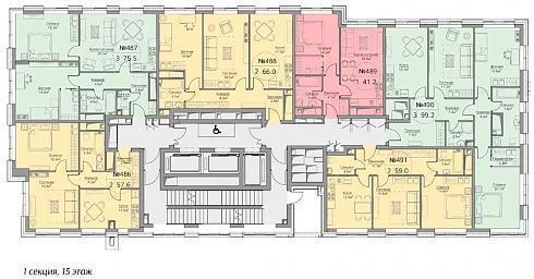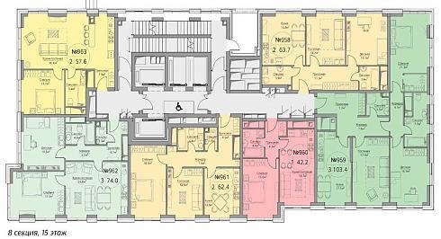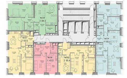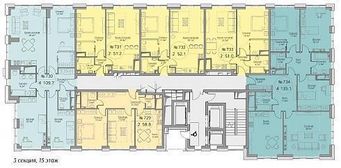 Конфигурация квартир в корпусе №3 «Vivo» в зависимости от этажа расположения может быть разной, но количество квартир на лестничных клетках в любом случае равно шести-семи (в ряде секций квартиры продаются с предчистовой отделкой MR Base):