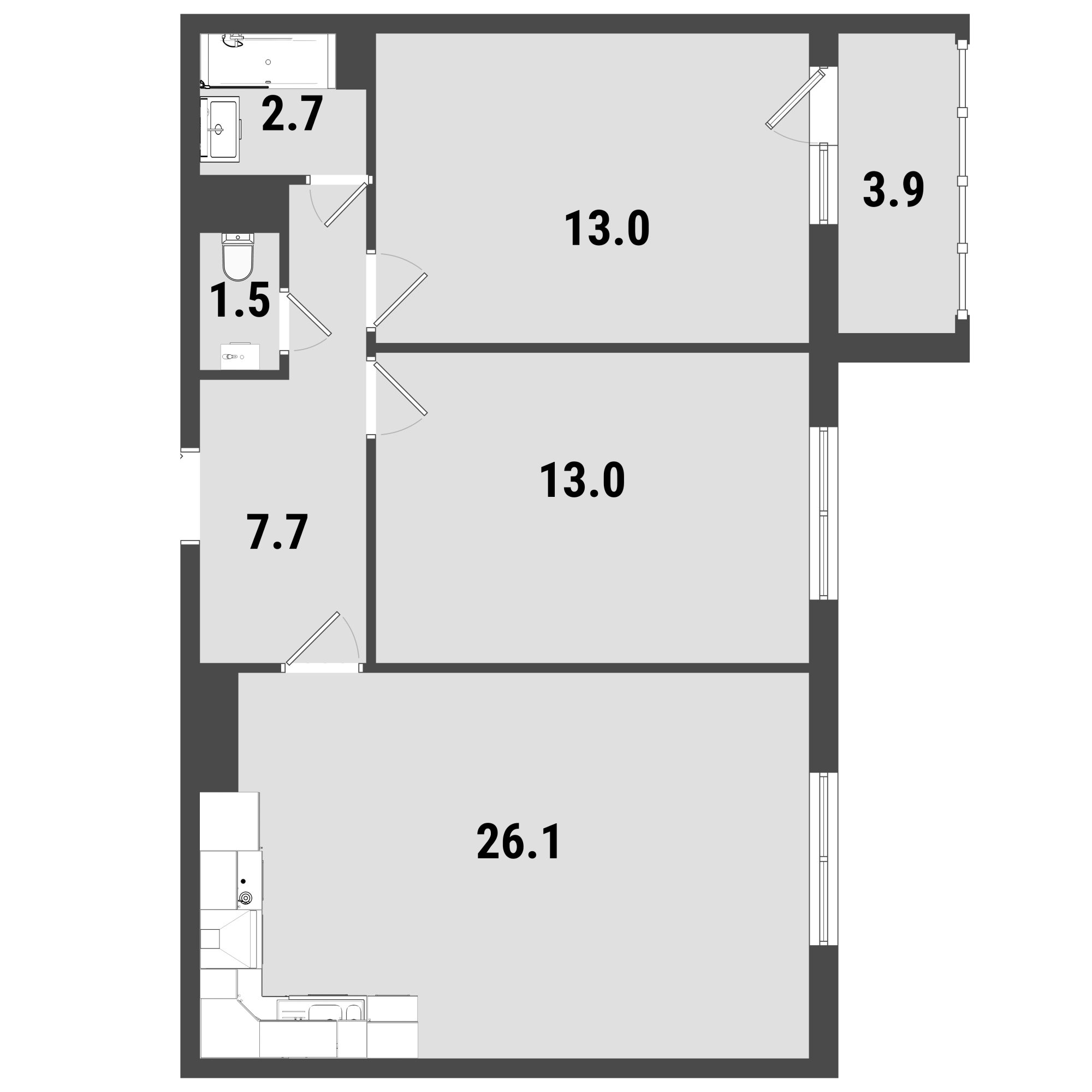 В корпусе №2 трешек оказалось намного меньше, при этом не совсем понятна причина скромности застройщика, оказавшегося от употребления термина «четырехкомнатная евро-квартира», который в данном случае был бы абсолютно уместен: