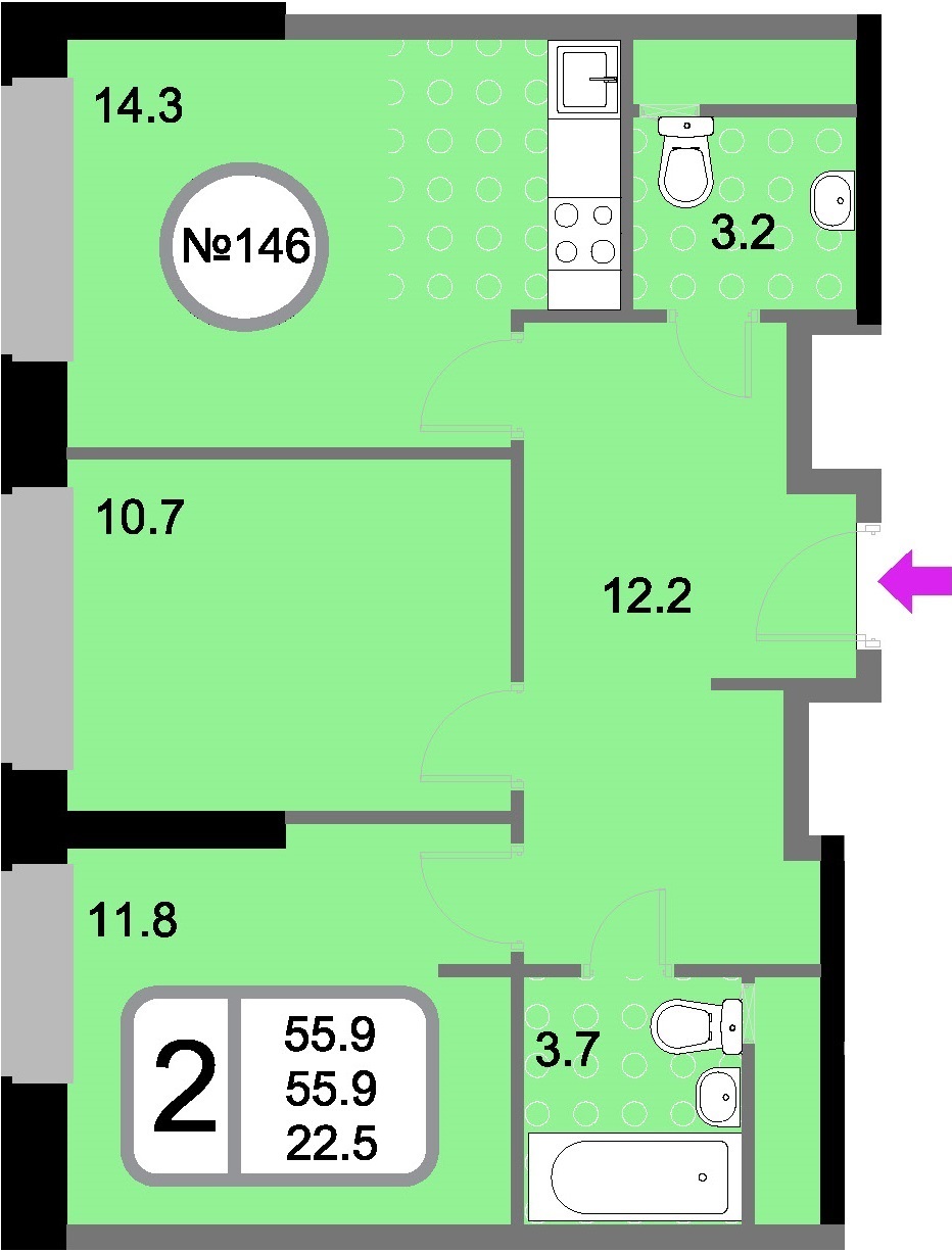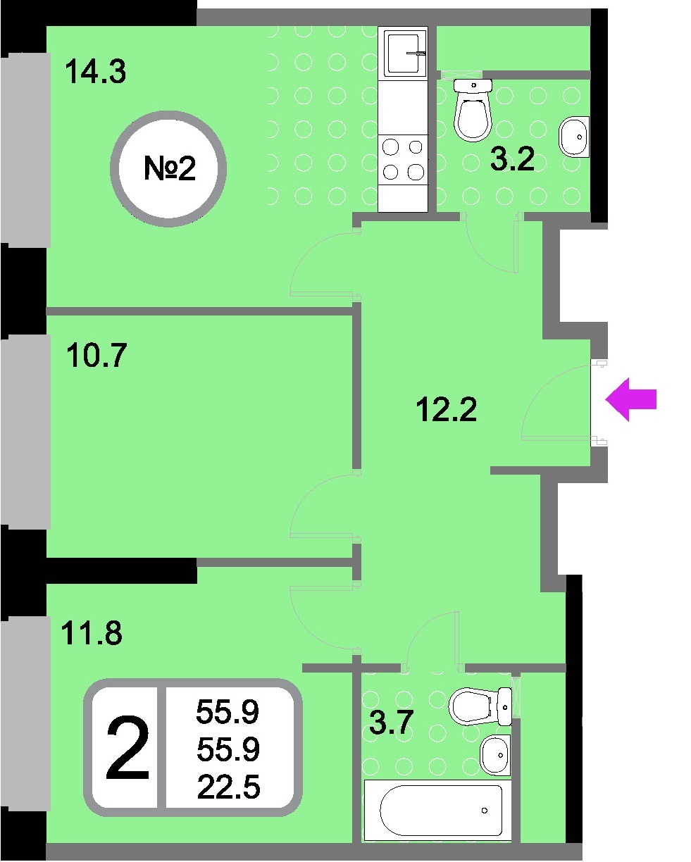 Площади двухкомнатных квартир в этом корпусе ограничены 61 кв. м.