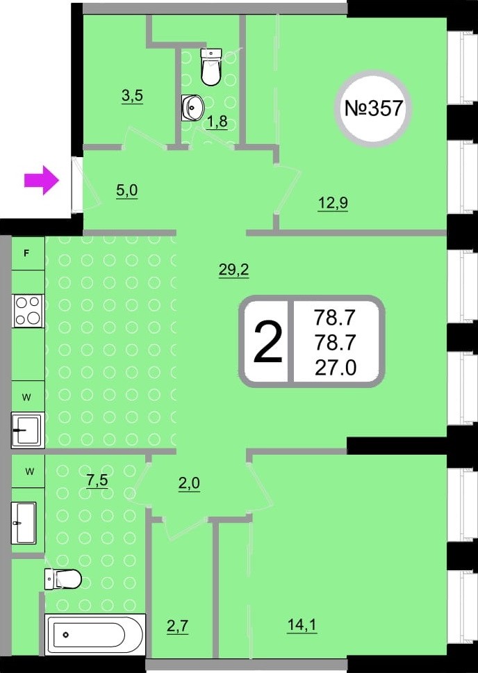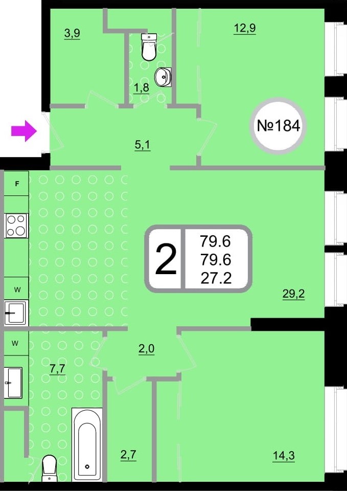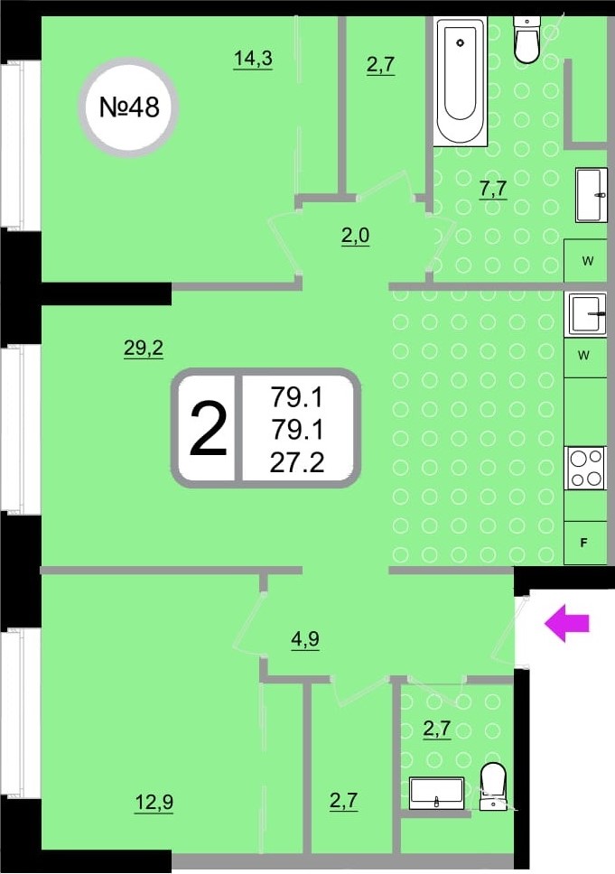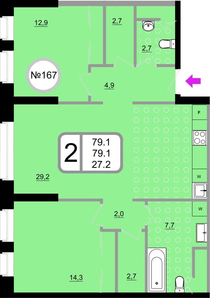 Самые интересные двухкомнатные квартиры находятся в 12 корпусе – 75 кв. м, два санузла, две гардеробные комнаты: