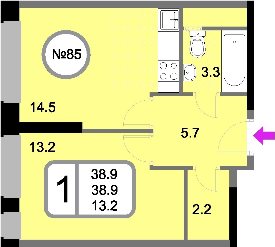 1-комнатная квартира  38.9 м2
