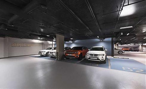 Размер стандартного машино-места — 2,5×5,3 м. Есть также несколько семейных машино-мест. На каждом уровне предусмотрены входы в лифты. В зоне паркинга будут установлены усилители связи.