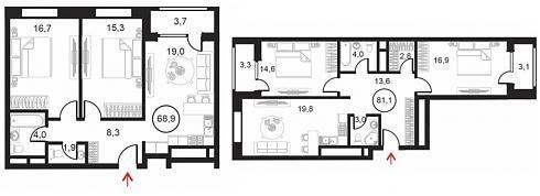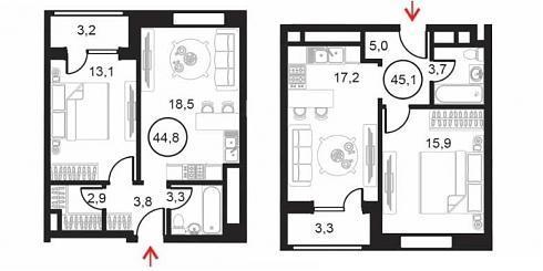 Площадь «линейных» двухкомнатных апартаментов чуть не доходит до 70 кв. м, тогда как их «распашные» собратья обладают уже серьезными 80 кв. м общей площади: