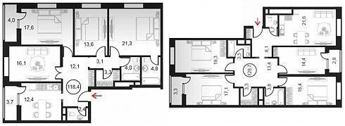Оба варианта планировки четырехкомнатных апартаментов заслуживают внимания. В первом случае санузлы будут побольше, а во втором дополнительные десять метров распределятся между комнатами: