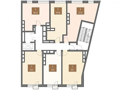 БЕННИ – здесь находится все самое интересное и, местами, необычное из мира апартаментов, которые можно купить в Комплексе, и стоимость их будет максимальной тоже в корпусе Бенни. Это пятиэтажная секция, характерная наличием в апартаментах очень больших окон. Первый этаж, как и в других корпусах, отдан под ритейл, апартаменты расположены со второго по пятый этаж. Апартаментов на лестничной клетке многовато – от 11 до 13. При этом собственно лестниц оказалось две, равно как и два лифта. Третий и четвертый этажи ничем не удивляют – площади апартаментов варьируются от 48 до 68 квадратов, обращает на себя внимание только наличие в каждом помещении как минимум двух огромных окон, так что покупатель, размышляя о планировках, может рассчитывать на полноценную однокомнатную или двухкомнатную квартиру.