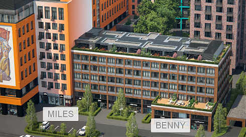 Семь апартаментов на втором этаже корпуса Бенни продаются вместе с террасами, причем террасы могут оказаться как меньше основной жилой площади, так и больше, их размер составляет от 35 до 71 кв. м.