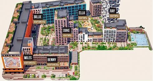 Апартаменты в ЖК ДЖАЗ располагаются в корпусах 1 – Бенни (Benjamin David Goodman), 2.3 – Майлс (Miles Dewey Davis) и 2.4 - Билли (Billie Holiday). Девятиэтажные Билли и Майлс примыкают к торцевым частям строения 2.1 Луи (Louis Armstrong), в котором размещены офисные помещения, пятиэтажный Бенни пристроился сразу за Майлсом. Корпус 2.1 Луи, не имея прямого отношения ни к продаже апартаментов и квартир, тем не менее, играет в Комплексе партию первой скрипки – именно он служит щитом, защищающим остальные корпуса от всех прелестей Третьего Транспортного Кольца.