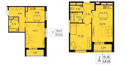 Если принять на веру утверждение, что однокомнатная квартира с большой кухней-гостиной автоматически приобретает статус двухкомнатной «евро» квартиры, то будет сложно объяснить, почему при практически одинаковом метраже и размере кухни одни варианты здесь считаются однокомнатными, а другие «европейскими»: