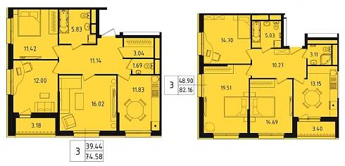 Трехкомнатные квартиры представлены в угловом или линейном виде – планировки схожи, разница в площади выглядит весьма существенной: