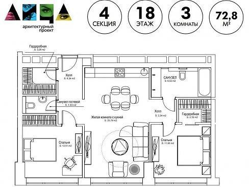 Открываем этаж и видим в продаже 3-комнатную квартиру общей площадью 72,8 кв. м: