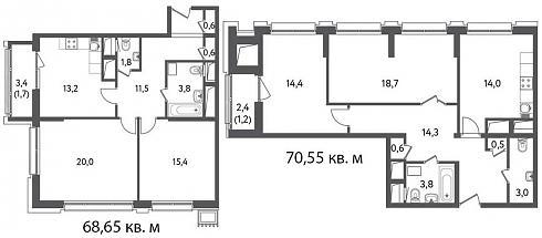 Площади двухкомнатных квартир находятся в районе отметки 70 кв. м. Большая кухня и гостевой санузел будут здесь в любом случае: