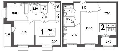 Двухкомнатные. На планировках квартир площадью 57,15 кв. м красуется цифра «1», хотя метров и окон здесь хватит не только на «попсовую» студию, но и на полноценную двушку. Линейные планировки обыденны, но неудачными их назвать нельзя: