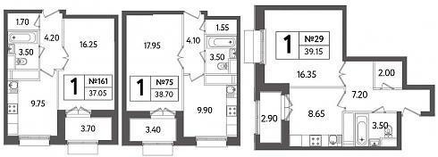 Однокомнатные. В любой такой квартире предусмотрена небольшая гардеробная комната, кухни имеют весьма скромные площади, планировки выглядят классическими с некоторыми нюансами в самых больших 39-метровых вариантах: