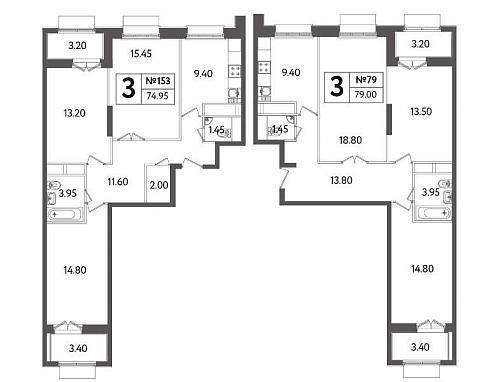 Трехкомнатные. Здесь Вас ждут исключительно «распашонки» с гостевым санузлом, двумя лоджиями и традиционно для данного ЖК небольшими кухнями: