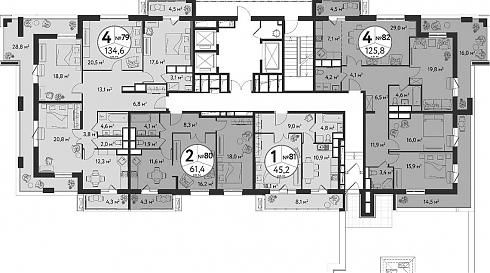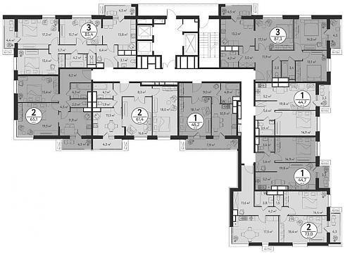 На этажах с 3 по 11 расположено по восемь квартир: