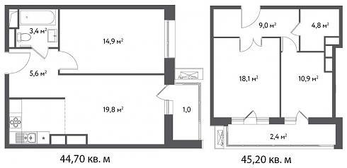 Однокомнатные квартиры обладают принципиально разной компоновкой: в вариантах общей площадью 44,7 кв. м Вы получите большую кухню-гостиную при скромной прихожей и небольшом санузле, а 45-метровые «однушки» при наличии довольно скромной кухни хороши большой лоджией с двумя выходами на нее и увеличенной площадью холла и санузла (при расчете метража лоджий применяется коэффициент 0,3):