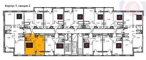 Так минимальное количество квартир в корпусе №7 покупатель найдет на 2-3 этажах первой секции, и на лестничных площадках секций 3, 4, 5, 6 и 8.